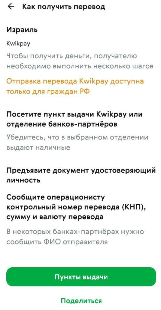 Для тех, кто предпочитает наличную валюту, в Avosend доступна опция с выдачей в авторизованных пунктах на территории Израиля. Получателю необходимо предъявить удостоверение личности и контрольный номер перевода (КНП).
